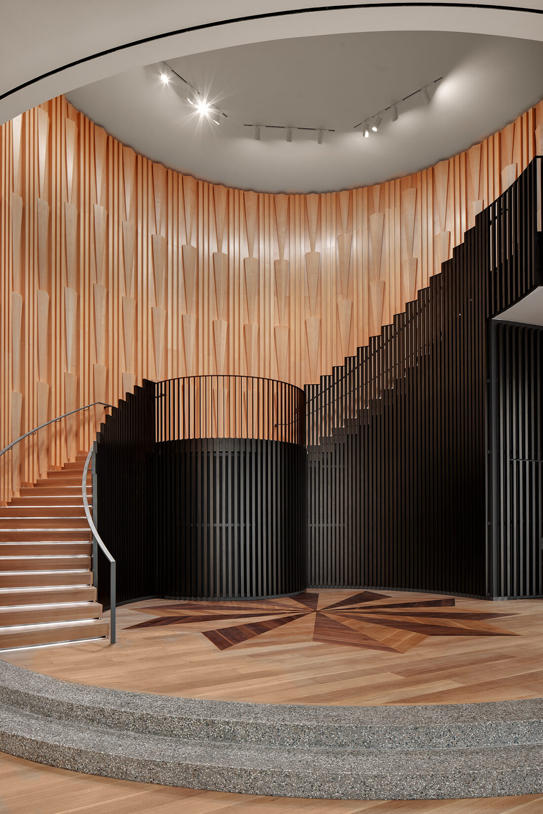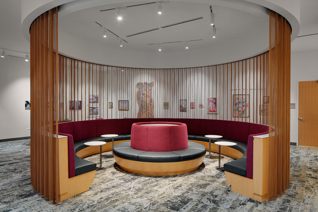 The main entrance lobby is combined with a two level Exhibition Gallery. This free-flowing space will have paintings, sculptures, a theater and performance spaces in an open inviting environment. The remainder of the building will have classroom and studio spaces for sculpture, wood and metal, ceramics, painting, dance, black box theater, music, orchestra, and recording. Faculty offices are located on every floor.