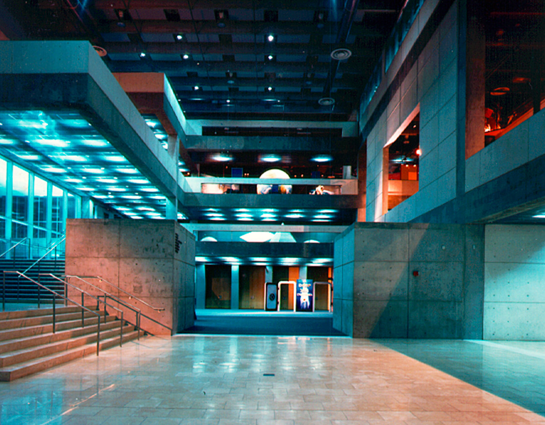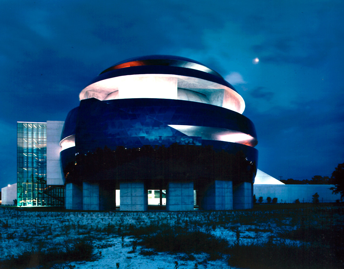 This is a 20 million dollar museum building with 30,000 SF of exhibit space, a 350 seat Omni Max Theater, a 200 seat Cafe, an auditorium and demonstration theater, administration offices and boardroom. The building features a unique spherical structure of reflective blue stainless steel exterior and concrete interior core. This is the space for the Omni Max dome theater. The sphere has a spiral ramp that is carved into the stainless steel, exposing the concrete core, which allows visitors to walk around, and up onto the top of the inner sphere observation and star gazing area.
